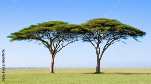 Two Acacia Trees on a Grassy Savanna Under a Clear Blue Sky