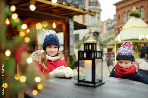 Two adorable sisters sitting having fun together on traditional Christmas fair in Riga, Latvia.