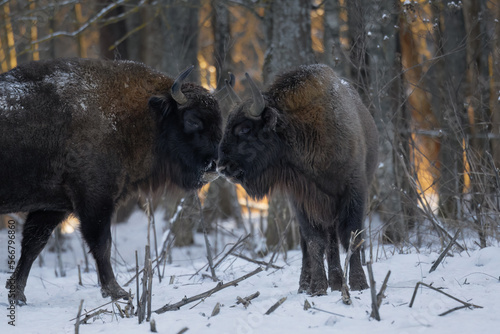 Two adult powerful bison met in a wild forest in the cold, covered with frost, against the background of a beautiful bright sunset.