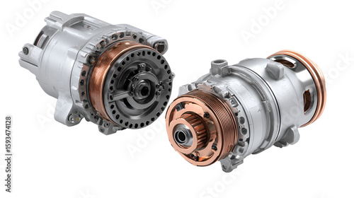 automotive, air compressor, compressor, engine, machine, mechanical, technology, engineering, industrial, metal, silver, copper, bronze, part, detail, closeup, innovation, machinery, equipment, mechanism, gear, system, component, intricate, complex, powerful, efficient, hard-wearing, performance, high technology, modern, manufacturing, industry, design, industrial design, metallic, grey, black background, studio shot