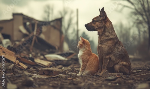 Two animals, a dog and a cat, sit together amidst the wreckage left by a tornado, embodying resilience and companionship in the face of disaster.