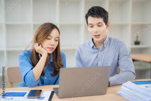 business, office, laptop, computer, working, together, asian, businessperson, man, woman, teamwork, collaboration, technology, datum, analysis, strategy, finance, marketing, sale, cyberspace, communication, connection, planning, project, management, meeting, discussion, corporate, professional, career, job, workplace, desk, document, chart, graph, information, report, growth, success, online, digital, modern, startup, company, executive, leader, team, partnership