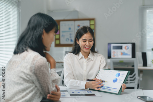 Two asian businesswomen analyzing financial charts and graphs, discussing marketing strategy in modern office