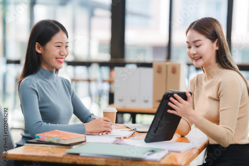 businesswoman, collaboration, teamwork, asian ethnicity, tablet, office, meeting, smiling, happy, communication, workplace, technology, discussing, project, planning, strategy, partnership, co-worker, colleague, desk, working, together, cheerful, positive, modern, workspace, indoor, corporate, professional, young adult, woman, adult, people, lifestyle, casual attire, business, job, occupation, employment, success, agreements, cooperation, discussion, brainstorming, analysing, studying, learning, education, book