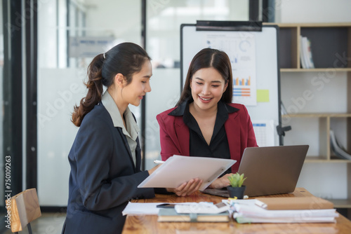 Two asian businesswomen discussing and reviewing documents in office. Professional workplace consultation. Corporate business and teamwork concept.