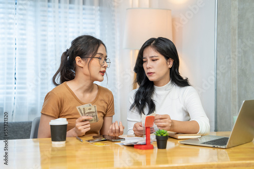 Two asian female friends as roommates are worried about finances and watching pay bills for water, electricity bills credit card bills rent at home, paying with