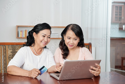Two Asian mature women sitting at the table together and looking at laptop computer they doing online shopping by credit card