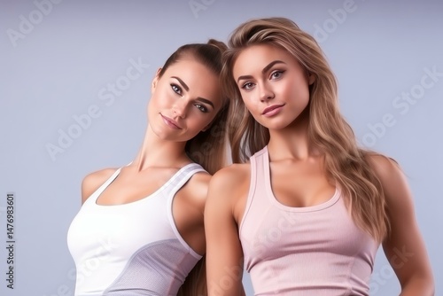 woman, fitness, activewear, sport, posing, healthy, lifestyle, wellness, beauty, health, 2, people, studio, shot, grey, background, looking, attractive, young, adult, fashion, clothing, tank, top, coiffure, blond, hair, brown, ponytail, make-up, skincare, well-being, active, exercise, physical exercise, gym, athletic, slim, toned, body, shape, portrait, female, girl, model, caucasian, indoor, sport, activewear