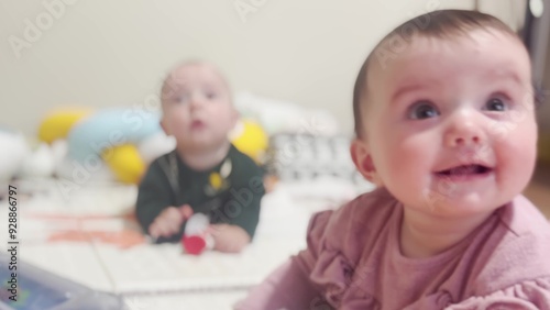 two babies play on the floor in kindergarten. happy family kindergarten kid dream concept. twins baby training hand rattle. newborn baby 6 months old playing on the floor in lifestyle kindergarten