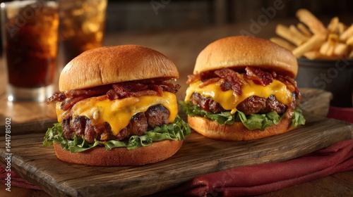 Two bacon cheeseburgers with lettuce on a wooden board, served with fries and soda in the background.