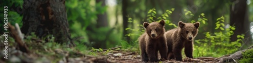 Two bears walking in the woods. The bears are small and cute, and the forest setting creates a sense of calm and tranquility