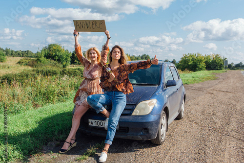 Two beautiful girls hitchhiking and vote with a sign ANYWHERE sitting on the hood of a car on roadside.