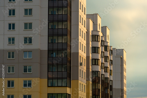 Two beautiful modern multi-storey buildings on the background of gray rainy clouds. Urban landscape. Residential development.