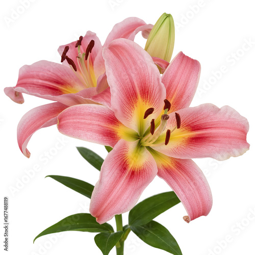 Two beautiful pink lily flowers blooming with green leaves on isolated transparent background, fresh and natural.