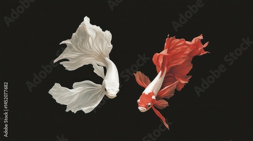 fish, betta, siamese, fighting, aquatic, animal, pair, duet, 2, white, red, colours, crimson, ivory, pearl, bright, high-coloured, contrast, black, background, minimalist, simple, elegant, fin, tail, body, scale, flow, movement, grace, beauty, delicate, underwater, nature, ocean, sea, duck pond, water, art, illustration, digital, painting, design, texture, smooth, soft, fantasy, calm