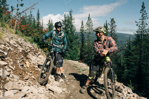 Two bikers take a break on the trail at the Timberline Bike park in OR