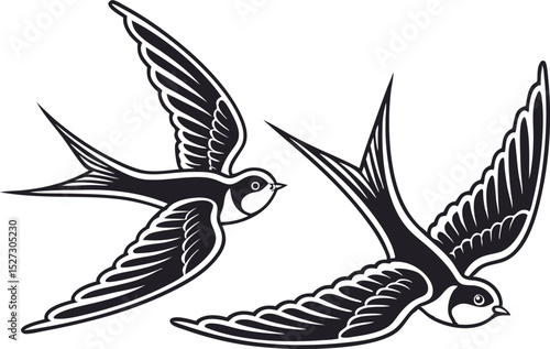 Two Black and White Swallow Birds Flying in Opposite Directions Illustration