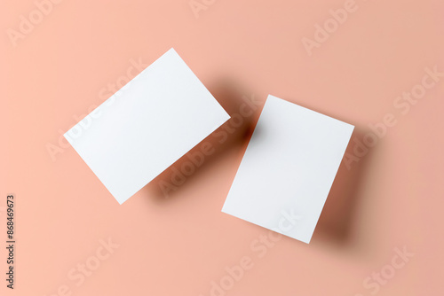 Two blank white cards mockup on a peach background, casting soft shadows, showcasing a minimalistic and clean design ideal for branding, presentations, or promotional materials