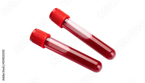 Two blood collection tubes with red caps filled with blood, designed for medical testing and laboratory analysis.