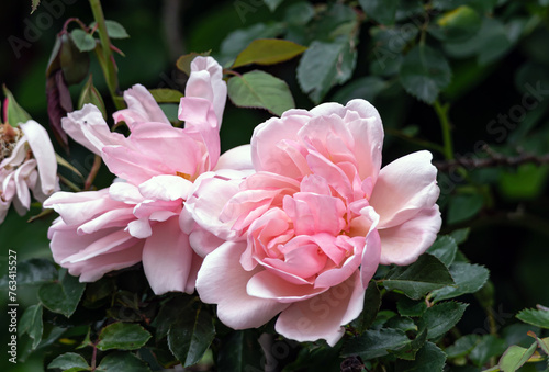 Two blossoming buds Roses Morgengruss surrounded by green foliage of a bush, in the garden. Rosa Felicia Albertine. Salmon pink color flowers, close up botanical background