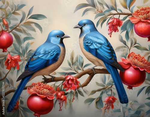 two blue birds on a branch with pomegranate flowers wallpaper mural background