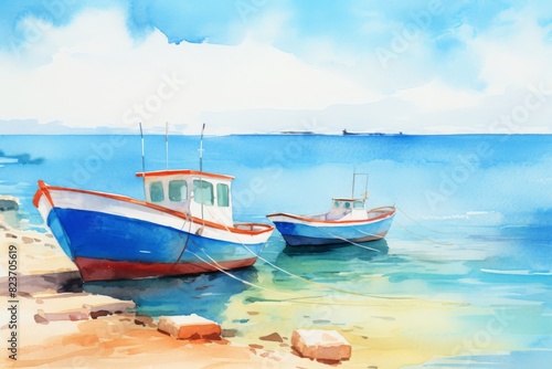 Two boats are docked on the shore of a lake,watercolor illustrations ,summer season.