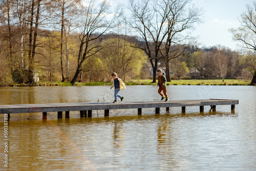 Two boys playing together outdoors, near to the lake. Water and sunny weather. Children have fun. Friendship. Beautiful view, nature.