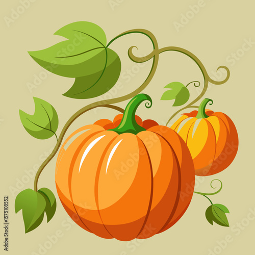 Two bright orange pumpkins with green vines and leaves on a light tan background