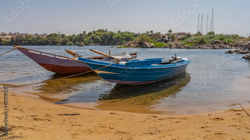 Two bright wooden boats are tied up near the bank of the Nile. There is yellow sand on the beach. Shadows and reflections on clear water. Green vegetation, boulders against the blue sky. Egypt. Aswan