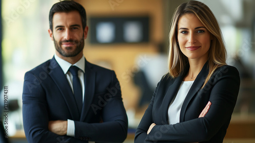 Two Business Professionals in Formal Attire: Head and Shoulders Portrait with Natural Side Lighting, Sharp Detailing, and Professional Ambiance