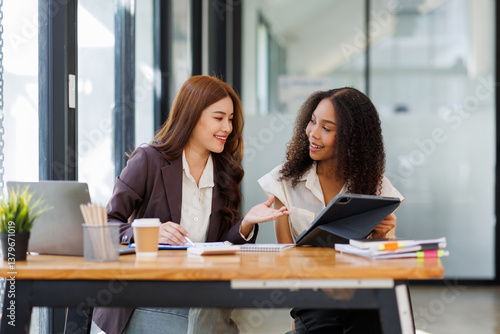 Two business women or an accountant team are analyzing data charts, graphs, and a dashboard on a laptop screen in order to prepare a statistical report and discuss financial data in an office