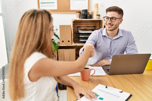 Two business workers smiling happy celebrating agreement with handshake at the office.