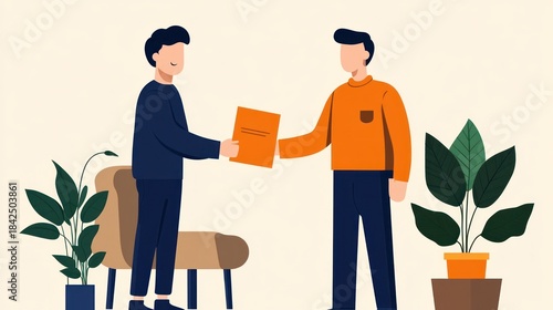 business, exchange, document, contract, agreements, partnership, meeting, transaction, handover, paperwork, office, corporate, professional, collaboration, communication, flat, modern, minimalist, man, indoor, plant, furniture, casual attire, discussion, deal, signing, transfer, information, datum, client, service, job, employment, receipt, portfolio, proposal, review, signature, success, teamwork, interaction, simple, vector