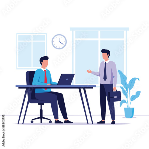 Two businessmen in office discussing project while one uses laptop and other stands holding briefcase
