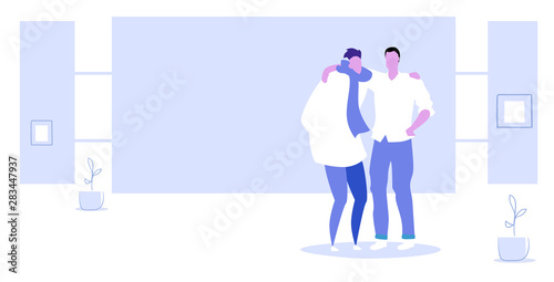 vignetting, horizontal, concept, man, character, standing, business, businessman, communication, colleague, communicating, company, meeting, cooperation, co-worker, discussing, employee, office, team, together, work, men at work, success, successful, corporate, businessperson, community, conversation, male, interior, partner, partnership, lifestyle, hugs, embracing, happy, cheerful, friends, friendship, couple, 2, friendly, guy, job, manager, casual attire, style, agreements, people, vector