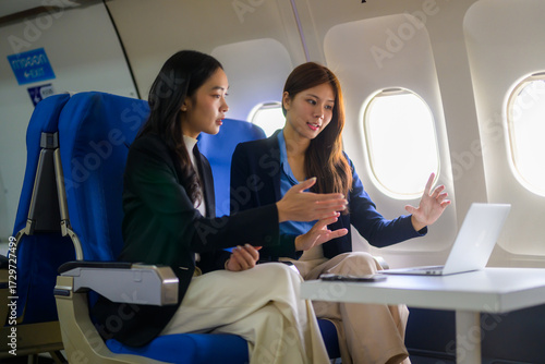 businesswoman, aeroplane, travel, colleague, meeting, laptop, working, flight, business, trip, professional, discussion, partnership, teamwork, corporate, communication, modern, technology, journey, aerodrome, aviation, executive, serious, analysing, strategy, asian, businesswoman, woman, tied-up, flying, indoor, consulting, explaining, sharing, creative, successful, confidence, intelligent, elegant, career, manager, co-worker, collaboration, office, passenger, global