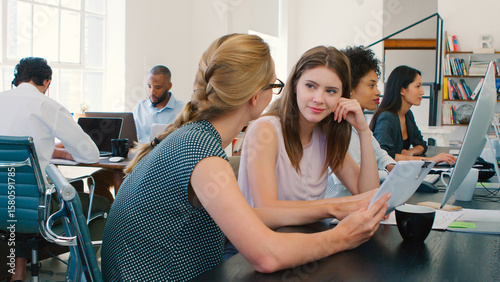 Two Businesswomen Having Informal Meeting Working At Desks In Modern Open Plan Office