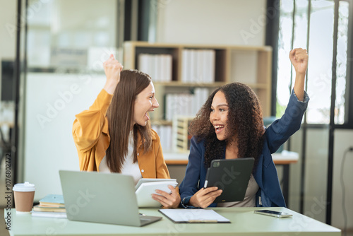 Two businesswomen rejoice in success in business Smile and express happiness success in starting teamwork concept