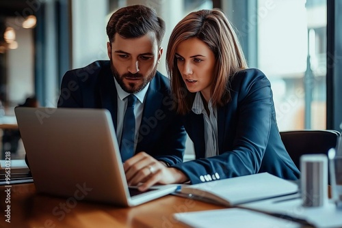 2, tied-up, professional, executive, team, laptop, modern, office, business, man, woman, leader, manager, working, computer, work, desk, conversation, financial, project, meeting, people, businesswoman, businessman, businessperson, teamwork, group, cyberspace, person, online, technology, looking, notebook, talking, together, sitting, couple, communication, job