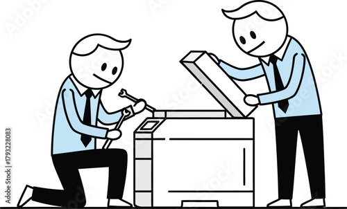 business, teamwork, collaboration, office, cartoon, illustration, man, people, working, project, writing, machine, operation, task, cooperation, partnership, team, businessman, colleague, employee, desk, document, paperwork, strategy, planning, analysis, process, efficiency, productivity, simple, drawing, vignetting