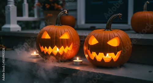 Two carved pumpkins with lit candles sit on a porch smoke swirling around them A door and railing are in the background