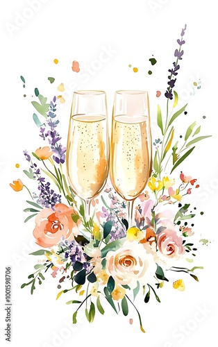 Two champagne flutes in floral arrangement, watercolor illustration.