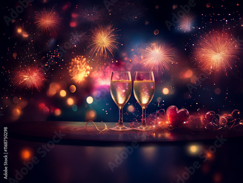 Two champagne flutes sit on a dark surface against a backdrop of vibrant fireworks and bokeh lights. Romantic hearts add to the celebratory scene.