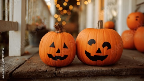 Two cheerful carved pumpkins sit on a wooden porch welcoming visitors to a festive fall scene.