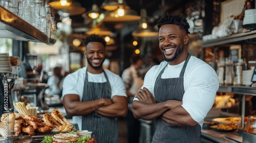 Two cheerful chefs smile proudly together in a bustling kitchen, embodying the joy of culinary arts and teamwork in the vibrant atmosphere of a restaurant setting.