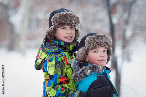 Two cheerful happy boys playing in winter park