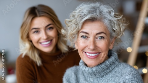 Two cheerful women share a happy moment indoors. older woman has curly gray hair and a warm smile, while the younger woman, with straight blonde hair, beams joyfully beside her