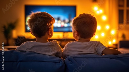 children, boy, couch, living, room, evening, warm, light, cosy, family, entertainment, screen, time, childhood, sibling, relaxation, bonding, interior, home, indoor, leisure, watching, enjoyment, sharpened, togetherness, playful, expression, joy, activity, viewing, lifestyle, happy, decor, casual attire, friends, comfort, engagement, night, happiness, innocence, theatre, soft, glow, emotion, children, warmth, quiet, connection, lighting