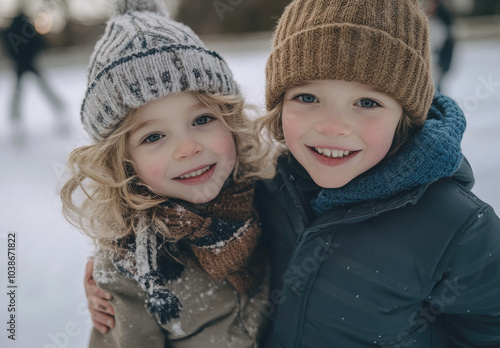 Two children ice skating on an outdoor rink, one child holding the other's hand and smiling at the camera