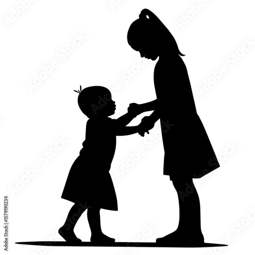 Two children playing together in silhouette on white background
